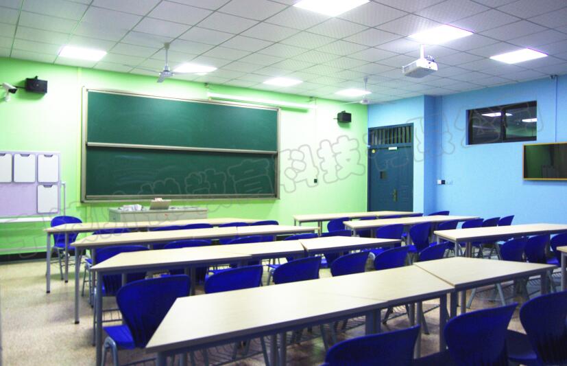 藍綠相間的清新色調(diào),讓這里的學習氛圍顯得格外的輕松愉悅。有別于傳統(tǒng)方式課桌,一張張?zhí)菪涡∽雷?,可自由拼接成圓形討論桌,有利于學生在課堂上的討論與互動。